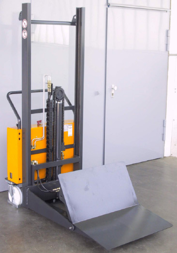 Der hier gezeigte Muldenhubwagen ist ein Sonder-Flurförderzeug, das Rollen bis 250 kg Gewicht und einem Rollendurchmesser von 250 mm bis 1.250 mm transportieren kann.
